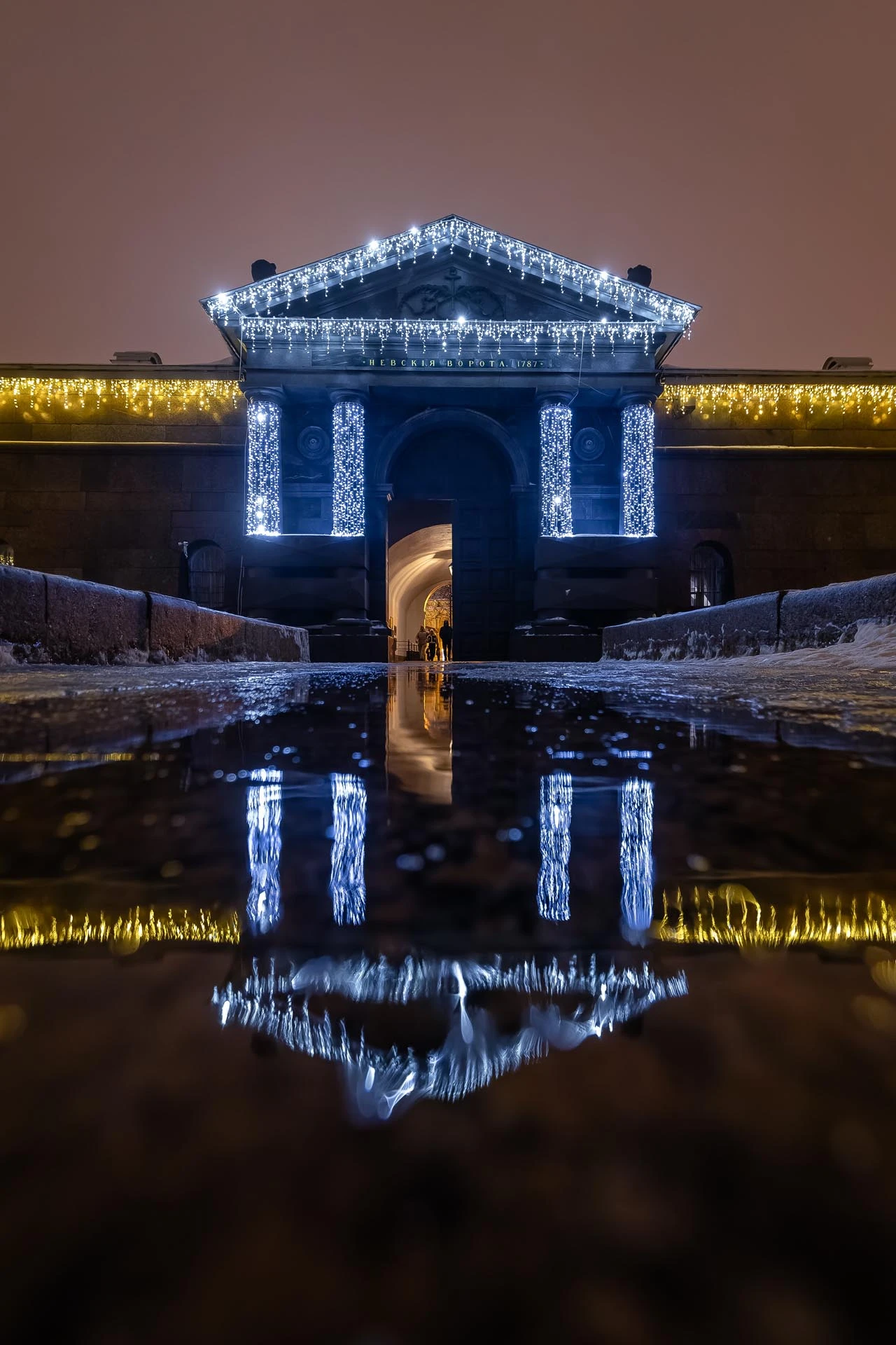 ✔ Теплые гирлянды, подчеркивающие архитектурные линии ворот и бастионов.