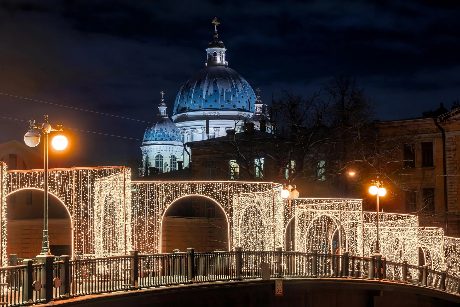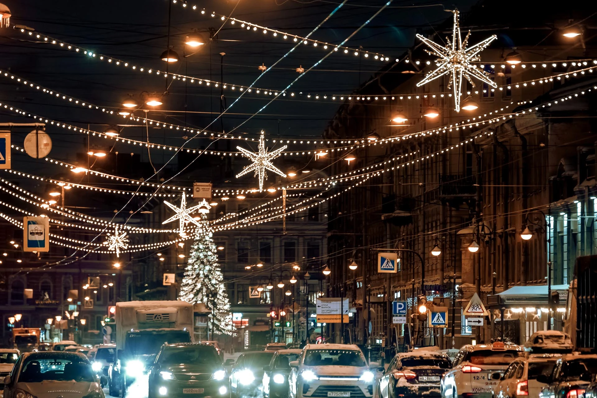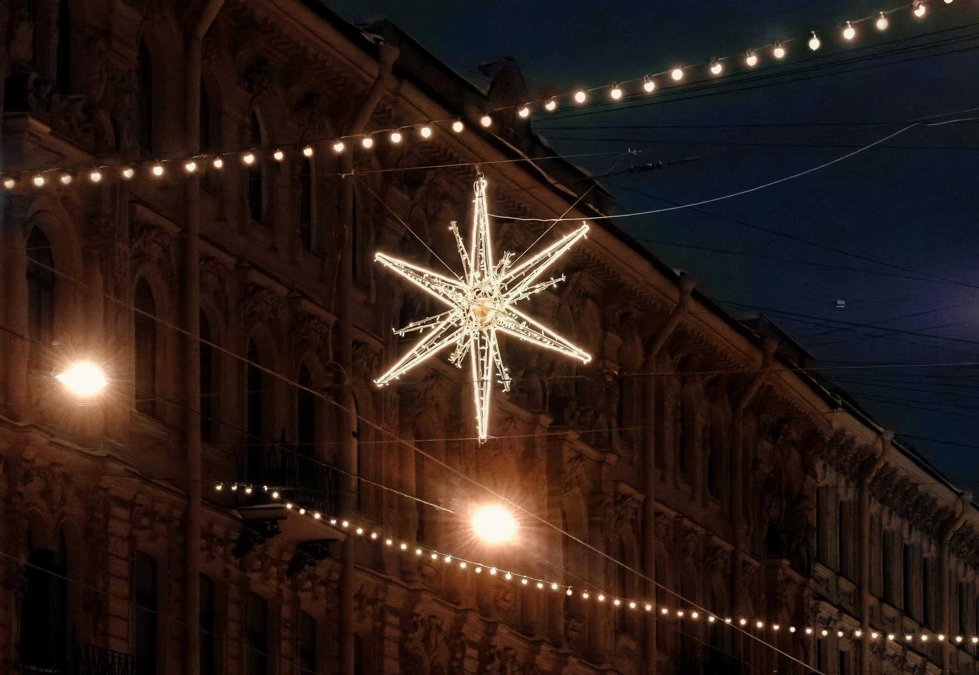 Главные магистрали города – Литейный и Владимирский проспекты – украшены элегантными световыми перетяжками из гирлянд BeltLight, создающими эффект мягкого, но насыщенного свечения. Дополняют композицию большие световые звезды, парящие над улицами и напоминающие о рождественском чуде.