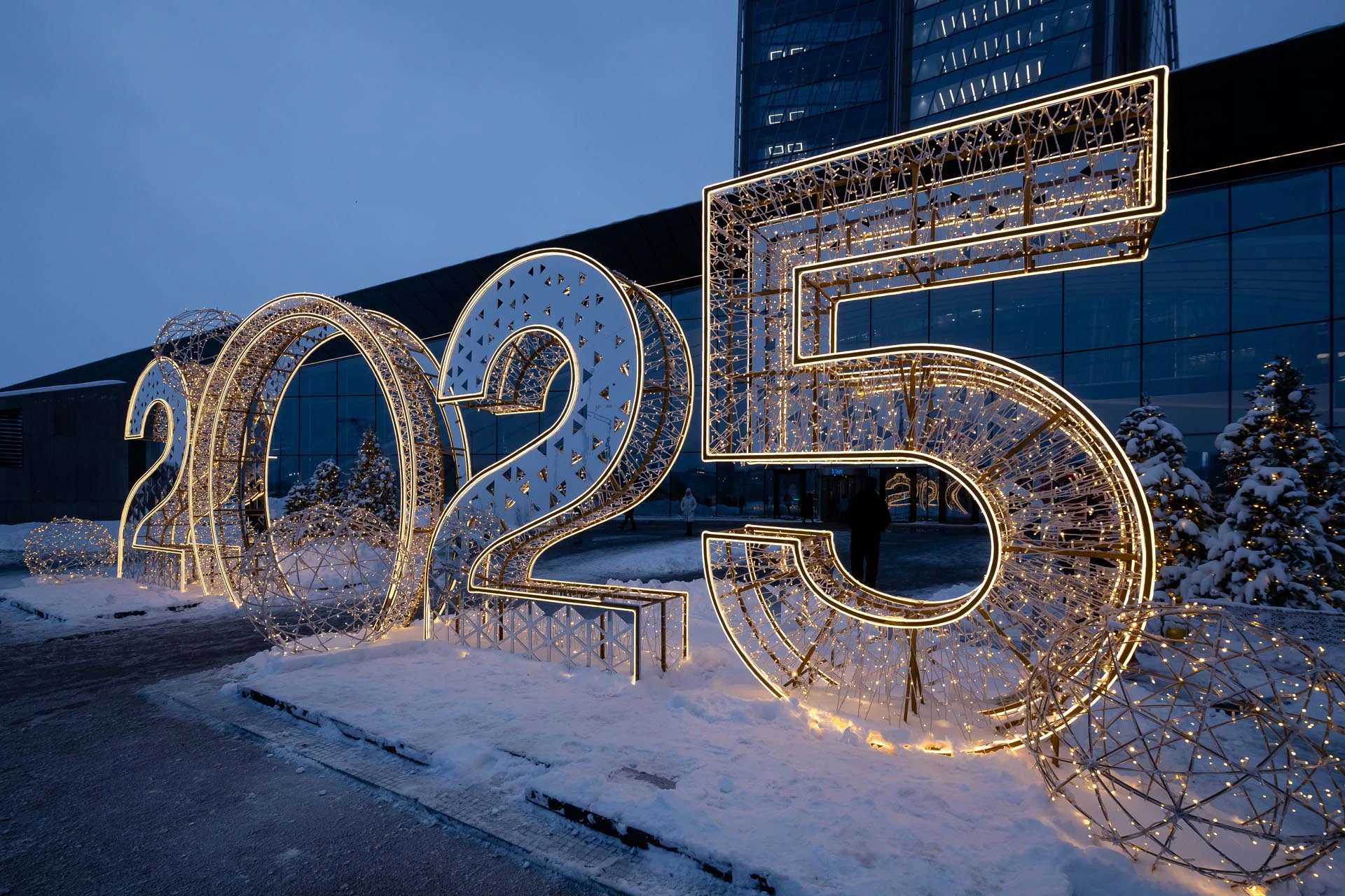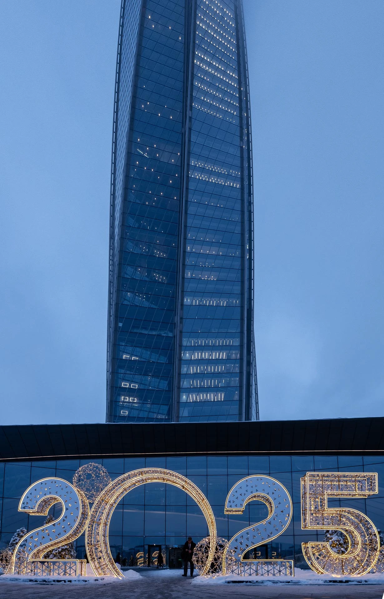 Парадную зону Лахта Центра украшала монументальная световая инсталляция “2025” – стильные цифры высотой более 3,5 метров с подсветкой. Конструкция выполнена в футуристичном дизайне, перекликающемся с архитектурой самого здания, и становится главным символом наступающего года.